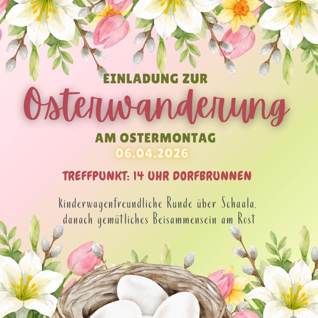 Herzlich laden wir wieder zur traditionellen Osterwanderung am Ostermontag ein. Lasst euch vom Weg überraschen. Der Ausklang findet an der FFW statt.